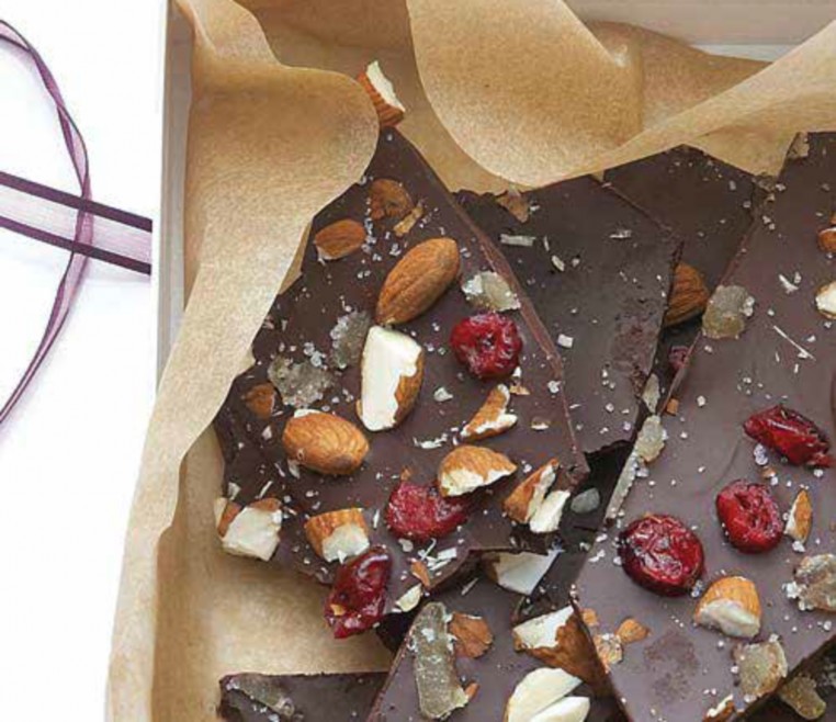 Once melted, tip into the prepared tin and smooth with a spatula so the chocolate is evenly distributed. Scatter over the remaining ingredients (you can add a pinch of dried chillies if you’re feeling brave) and chill in the fridge until the chocolate sets (about 30 mins). Peel off the parchment and break into pieces. Store in an airtight container for up to a month (if it lasts that long).
